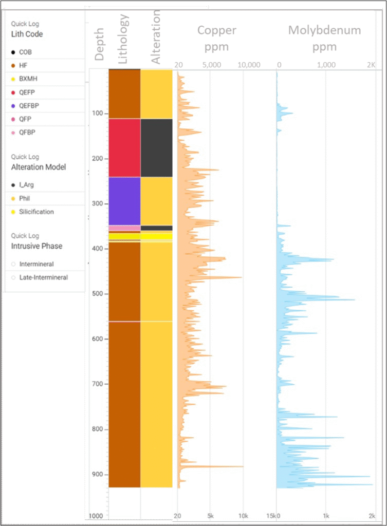 - 755.45 – 909.65m: Mineralized intermineral and early porphyry with hydrothermal breccia zone.