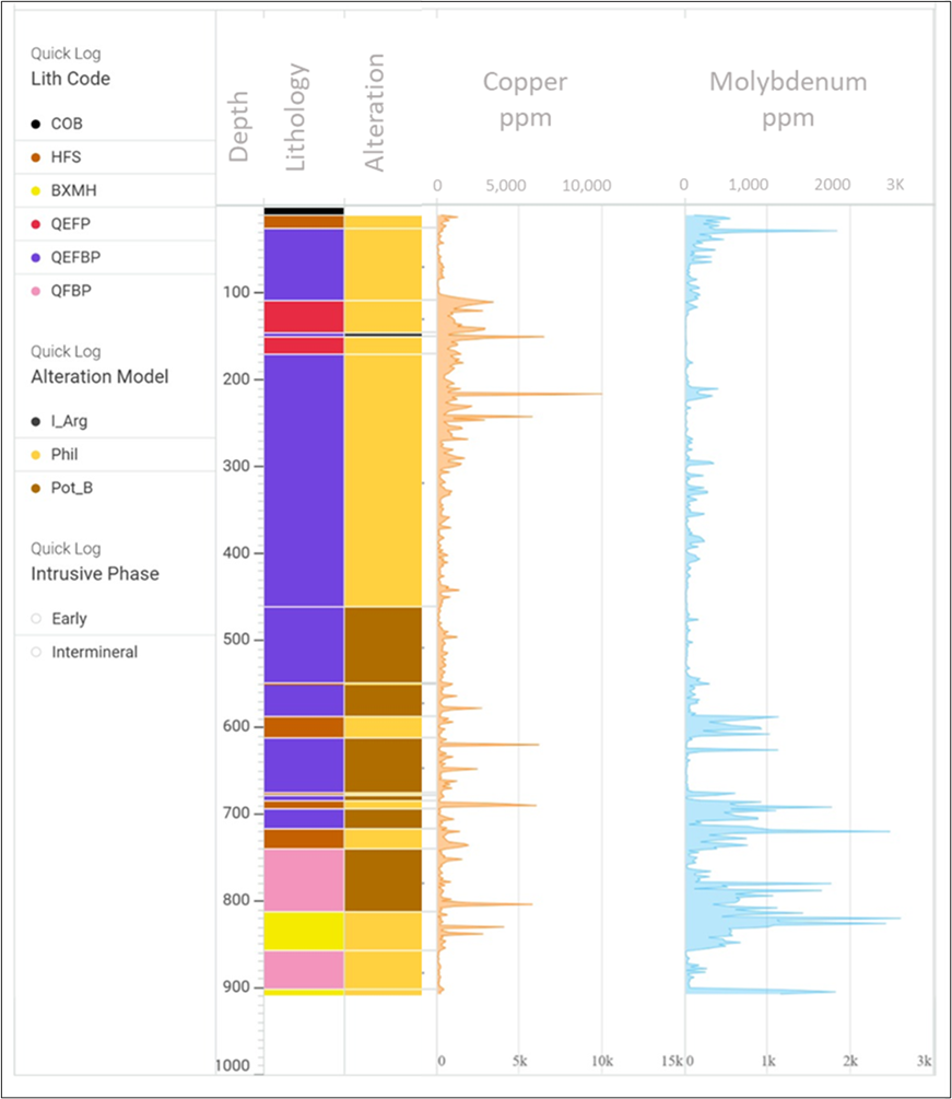 Figure 5: Aurora Project – Simplified Drill Log for A25-024 (COB: Cover/Overburden, HF: Hornfels, BXMH: Hydrothemal breccia, QEFP: Quartz-eye-feldspar porphyry, QEFBP: Quartz-eye-feldspar-biotite porphyry, QFBP: Quartz-feldspar-biotite porphyry, I_Arg: Intermediate argillic, Alteration Phil: Phyllic alteration, Pot_B: Potassic (biotite) alteration).